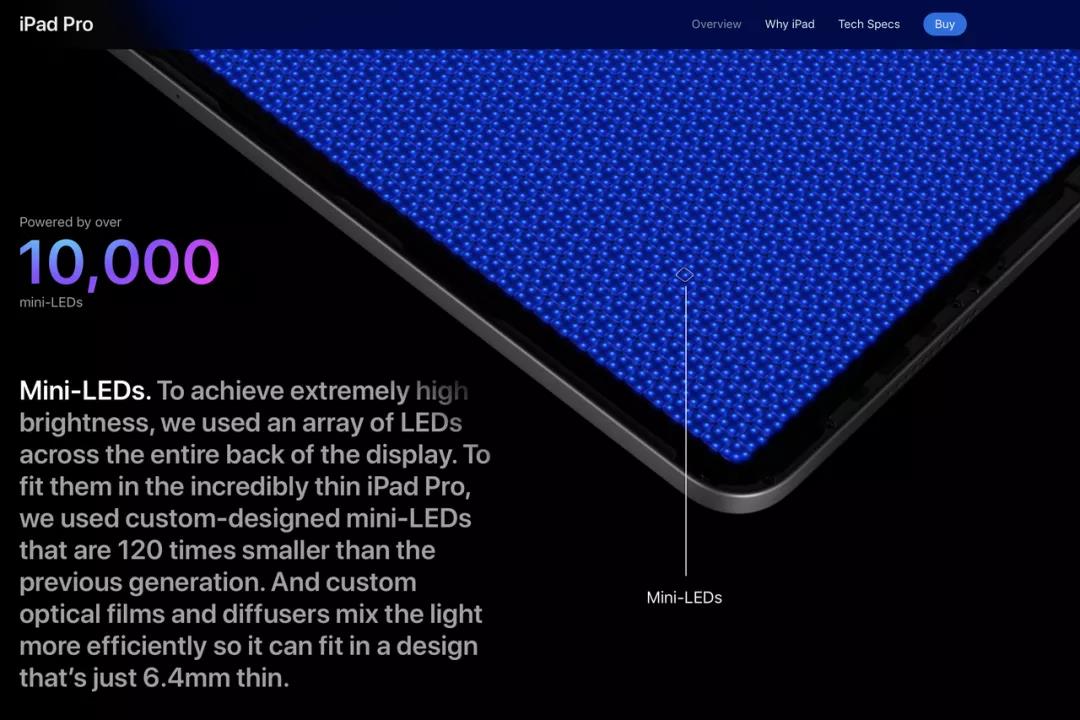 Mini LED的每一個(gè)背光“燈泡”都很小,能夠?qū)崿F(xiàn)更精密的動(dòng)態(tài)背光效果,在有效提高屏幕亮度和對(duì)比度的同時(shí),還能抑制傳統(tǒng)大燈泡動(dòng)態(tài)背光在屏幕亮暗區(qū)域之間造成的眩光現(xiàn)象。