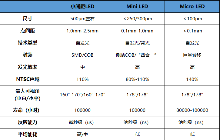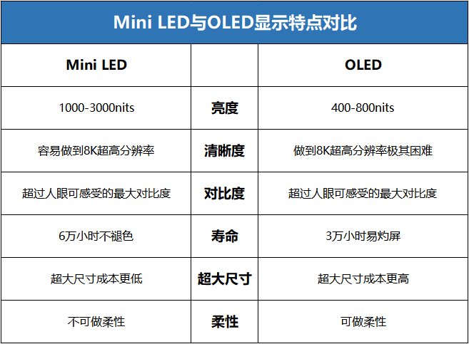 對(duì)比1:Mini LED性能優(yōu)于小間距LED,且比OLED更為成熟。